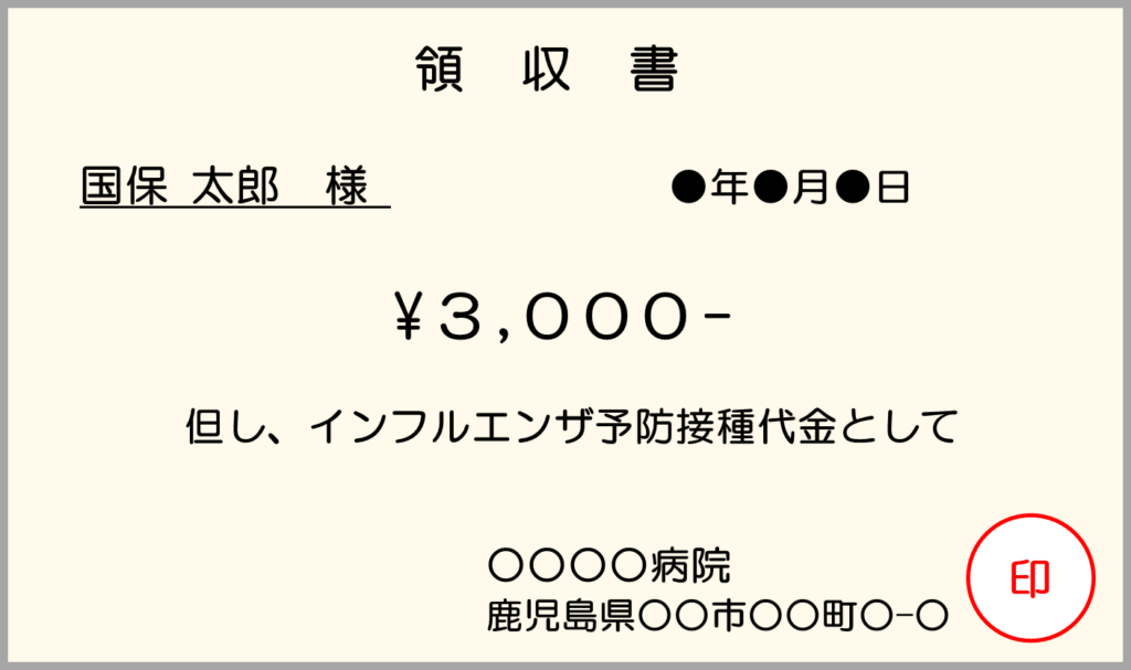 - インフルエンザ予防接種代であることが明記されていること。機械印字の領収書の場合でも必ず”インフルエンザ予防接種代”とわかるよう書き添えてもらってください(手書き可)。インフルエンザ予防接種とわかる明細書がある際は、領収書と一緒に提出してください。